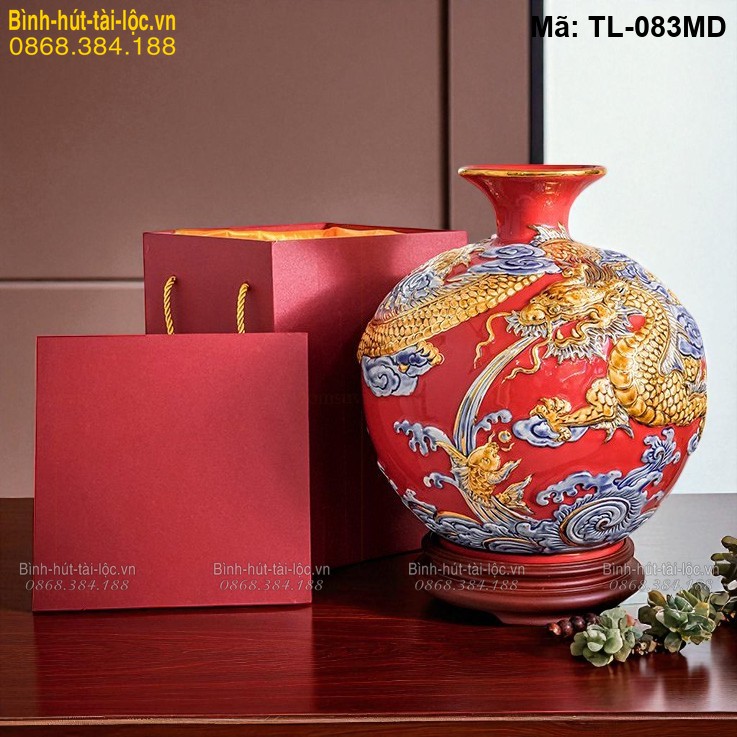 Điểm đặc trưng của TL-083MD nằm ở hình tượng rồng – linh vật đứng đầu trong tứ linh, biểu trưng cho sức mạnh, quyền lực và khả năng chiêu tài. Khi được thể hiện dưới dạng đắp nổi trên nền gốm cao cấp, hình ảnh rồng càng trở nên sống động và có chiều sâu, giúp gia tăng giá trị thẩm mỹ cho sản phẩm. Màu đỏ kết hợp với họa tiết rồng tạo nên một tổng thể hài hòa, vừa mang tính truyền thống vừa có sức hút mạnh mẽ. So với các dòng mang ý nghĩa chuyển động như bình hút lộc thuận buồm xuôi gió, mẫu rồng đỏ tập trung vào yếu tố quyền uy và khả năng giữ tài lộc ổn định, rất phù hợp với những người làm kinh doanh hoặc giữ vị trí lãnh đạo.