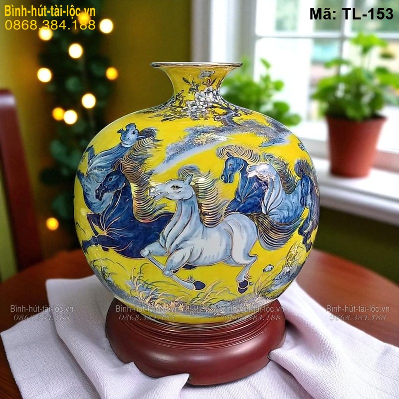 Điểm ấn tượng của TL-153 nằm ở sự phối hợp hài hòa giữa màu sắc và họa tiết. Nền vàng tượng trưng cho tài lộc, kết hợp cùng hình ảnh “Mã Đáo Thành Công” tạo nên nguồn năng lượng tích cực mạnh mẽ. Dáng bình chuẩn phong thủy giúp thu hút và giữ vượng khí, đồng thời làm nổi bật không gian trưng bày. Để phát huy tối đa ý nghĩa, việc lựa chọn vị trí đặt bình rất quan trọng, bạn có thể tham khảo thêm tại bình hút tài lộc đặt ở đâu để hiểu rõ hơn về cách bố trí hợp lý. Sản phẩm phù hợp đặt tại phòng khách hoặc nơi làm việc nhằm gia tăng vận may và sự hanh thông.